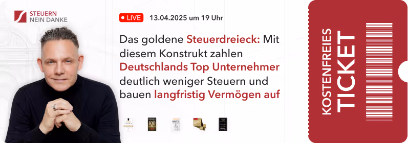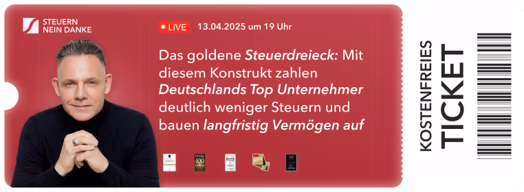 Du verstehst das Prinzip des goldenen Dreiecks der Steuerarchitektur. Die Strukturen, die Konzerne seit Jahrzehnten nutzen, und bekommst das Wissen, wie du deine Gewinne langfristig steuerlich intelligent organisierst: Für mehr Vermögen, mehr Sicherheit und mehr Freiheit in deiner finanziellen Zukunft.